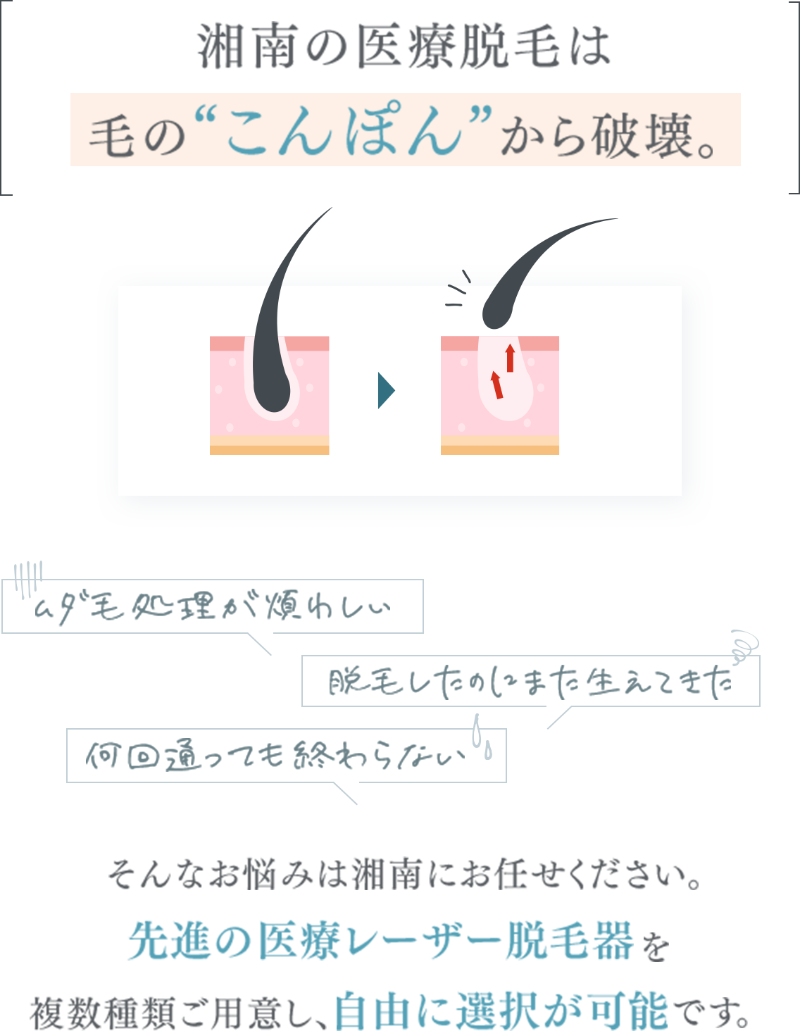 医療従事者しか取り扱いができない高出力の医療脱毛器を使用。発毛組織を破壊 することができるので、根本的に毛を無くす ことができます。医療脱毛は エステ脱毛よりも効果が高く、少ない施術回数で脱毛が完了 します。