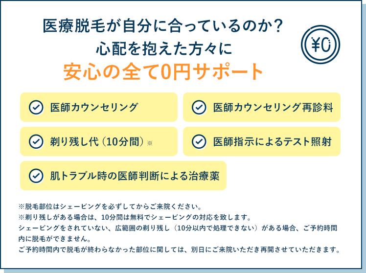 ※毛周期によってまばらに生えてくる毛もございます、詳しくはスタッフまでご相談ください。(VIOは保証対象外)