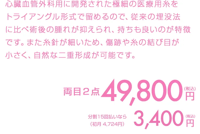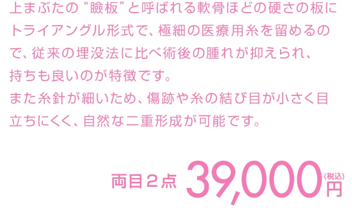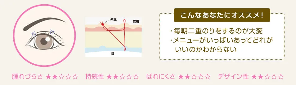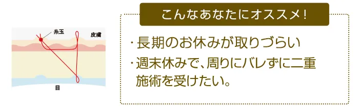 施術の説明:特殊な糸の結び方で、まぶた表面に針を通す事がないため傷をつけずに二重を作れる施術法です。