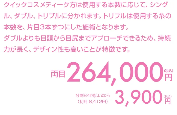 クイックコスメティークNeoは使用する本数に応じて、シングル・ダブル・トリプルに分かれており片目に使用する糸の本数を表しています。糸の本数が増すごとに持続力が上がるため取れづらい埋没法をご希望の方は、ダブル以上をおすすめします。