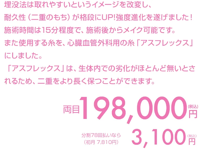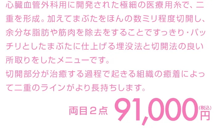 二重埋没法を800件以上執刀したドクター、または分院長以上のドクターのみ、施術が許された腫れが極めて少ない、耐久性の高いメニュー