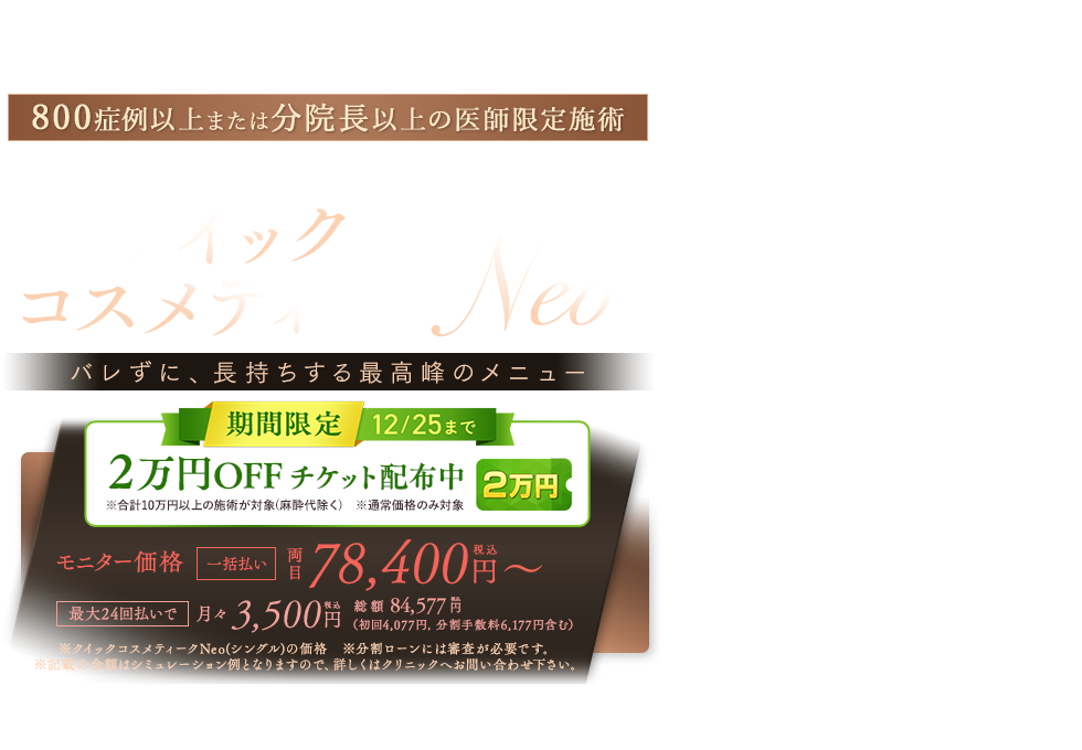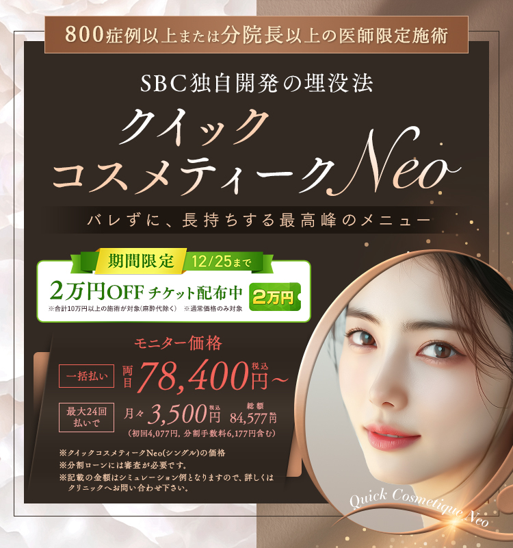 クイックコスメティークNeo、クイックコスメティーク・ダブルNeo、クイックコスメティーク・トリプルNeoは、表に全く傷が付かず、結び目が気にならない、当日からお化粧が可能、また腫れも最小限、持ちもいいという特徴を持つ、医学的には経結膜的埋没法重瞼術(二重術)と言う画期的な埋没法です。瞼表面に針を通す事が無く傷が付かない→ 腫れが極めて少ない 傷が気にならない当日からお化粧が可能。埋没糸・結紮点が裏側(結膜側)に全く露出していない → 安全 結び目が気にならない。挙筋法による埋没法 → 瞼板法に比べライン持続率もいい。