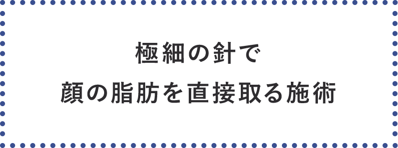 施術の説明:切開なしで脂肪を直接抽出できるので、脂肪溶解注射より確実に、脂肪吸引よりダウンタイムを少なく、狙った部分の脂肪を減らすことができる安全・確実・簡単な部分やせ術です。
