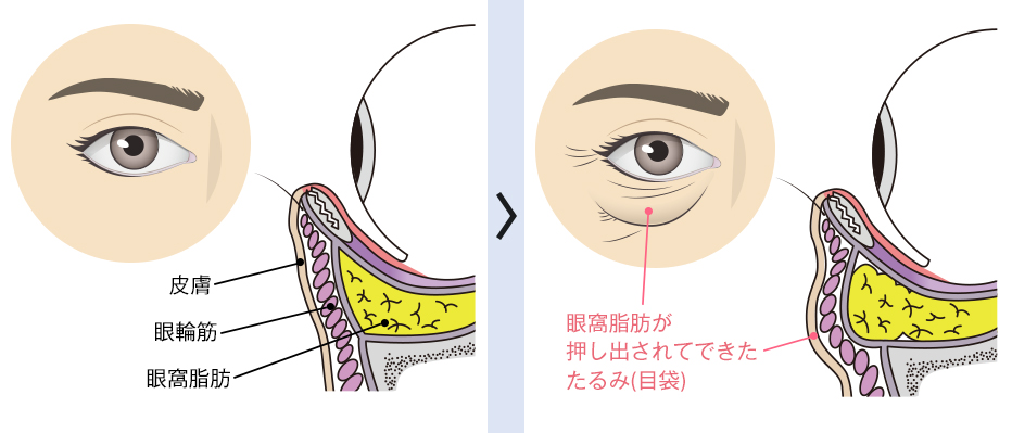 下まぶたの眼窩脂肪が生まれつき多い方や、加齢、眼精疲労に伴い皮膚や眼輪筋のたるみにより支えきれなくなった眼窩脂肪が押し出された場合、下まぶたにたるみ(目袋)が形成されます。たるみに伴って凹凸が目立ってくると「影」ができ、これが「クマ」「ふくらみ」とも表現されます。