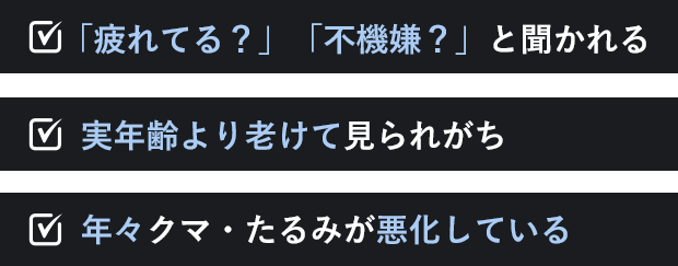 加齢などが原因で一度できてしまった目の下のクマやたるみは、マッサージや化粧品などのセルフケアでの解消は難しいのが現実です。